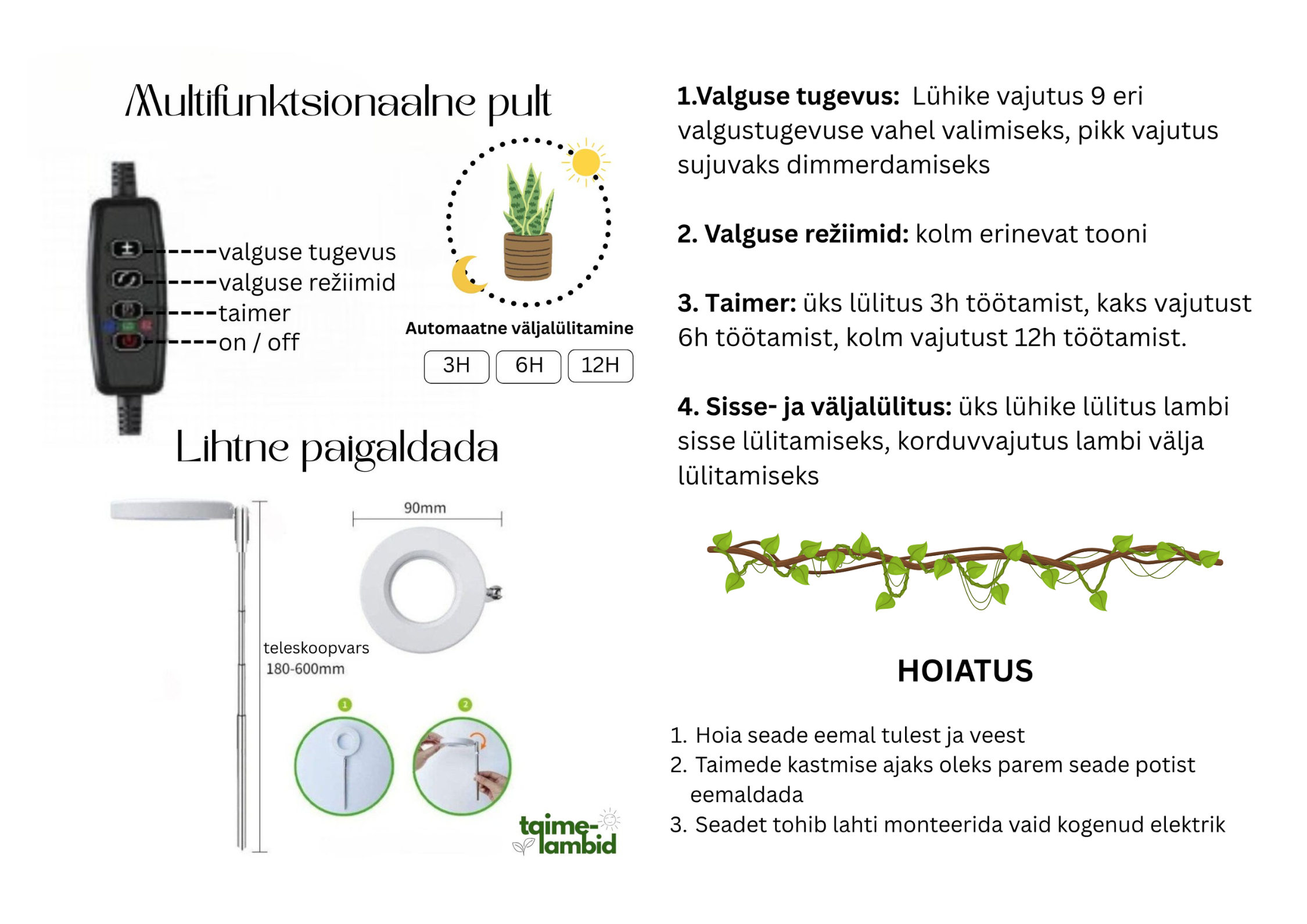 Selle taimelambi vars on pikendatav teleskoop ja kasvab seega koos sinu taimega. Varre saab suruda mulla sisse.
